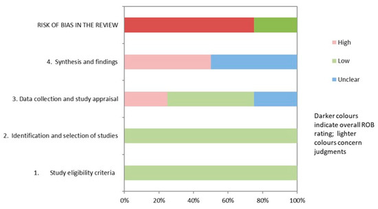 Table 4 and Figure 2 show the results of the risk of bias assessment using ROBIS. In total, 25% of studies had a low risk of bias. The domains related to the “study eligibility criteria” and the “identification and selection of studies” had the lowest risk of bias (100%). In contrast, the domain related to the “synthesis and findings” had the highest risk of bias (50%). The inter-rater reliability for the risk of bias assessment was high (κ = 0.78).