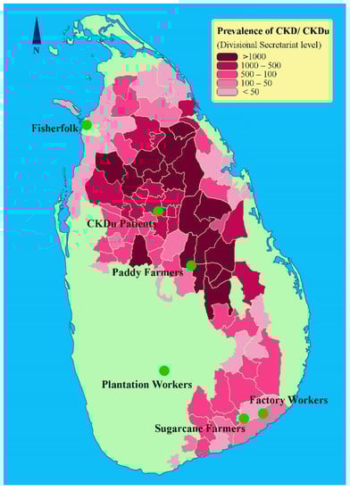 - Jayatilake, N.; Mendis, S.; Maheepala, P.; Mehta, F.R.; CKDu National Research Project Team. Chronic Kidney Disease of Uncertain Aetiology: Prevalence and Causative Factors in a Developing Country. BMC Nephrol. 2013, 14, 180. [Google Scholar] [CrossRef] [PubMed] [Green Version]