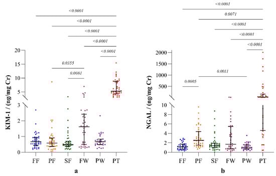 | Study Group | KIM-1 (ng/mg Cr) | NGAL (ng/mg Cr) |