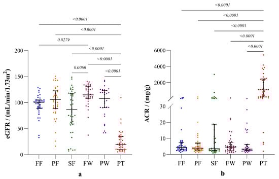 | ACR (mg/g) | 4.455 (2.885–7.645) | 3.945 (2.755–7.110) | 3.640 (2.415–18.88) | 4.600 (2.323–7.613) | 3.350 (2.430–6.350) | 1105.00 (227–2458) |