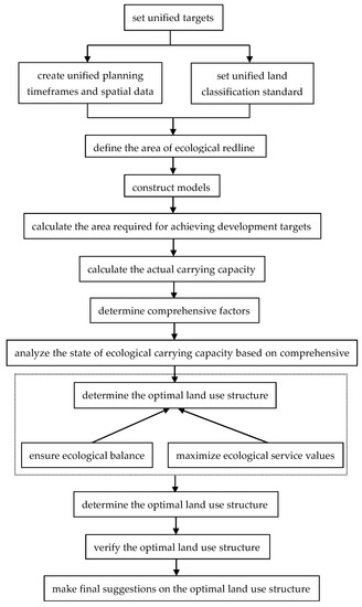 Learning from the ecological footprint theory, we should first clarify the area of the ecological redline of a county. Then, we can construct models according to the corresponding relationships between socio-economic activities and different land-use types, the development law, and the accounting rules of socio-economic development, in order to calculate the areal demands of different land-use types for achieving the socio-economic development targets. After that, we need to compare the areal demands and the actual carrying capacity of various land-use types (deducting the area of the ecological redline) for the socio-economic development of a county, in order to obtain the state of the land-use structure. In addition, drawing on its normalization method, we can convert the ecological service values of different land-use types into comprehensive factors, which serve as the basis for determining the optimal land-use structure. The process of this decision is based on the principle of ensuring ecological balance and maximizing the ecological service values provided by county-level land. In order to make the optimal land-use structure more scientific, we also need to verify it with respect to the targets that have been concerned in China’s land-use, and put forward final suggestions for it. In addition, it should also be noted that the Chinese practice of Multiple Planning Integration has proved that the unification of planning timeframes, spatial data, and land classification standards is also important for the optimization of land-use structure. A flowchart of research methods is shown in Figure 1.