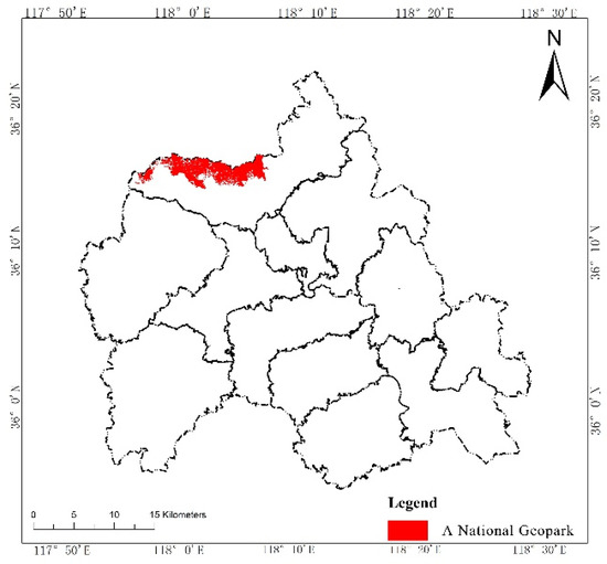 According to the Technical Guide for Delimitation of Ecological Redline, we first evaluated the intensity of the ecosystem service functions and the sensitivity level of the ecological environment in W County, based on the third National Land Survey Database (Figure 2 and Figure 3). Then, we initially delimited land with important ecosystem service functions and high ecological sensitivity in the county to the ecological redline (Figure 4). As an example of an ecological element that must be regulated, a national geopark is shown (Figure 5), with six such elements in W County. The initial ecological redline, superimposing all ecological elements that must be regulated, identified an area of 41,319.28 ha in W County (Figure 6).
