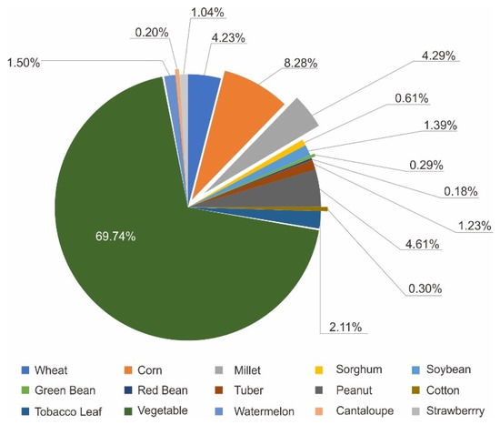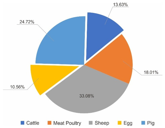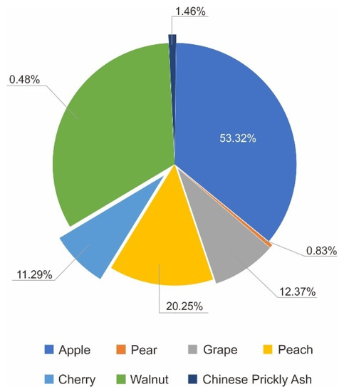 The proportion of each product contributing to the total output value of primary industry was calculated based on their contribution from 2016 to 2020. We used the average value over the five years. The output value for agriculture carried by cultivated land, and agriculture carried by garden land, forestry, animal husbandry, and fishery in W County accounted for 18.24%, 52.47%, 4.30%, 23.15% and 1.84%, respectively, the proportion of internal products is shown in Figure 7, Figure 8 and Figure 9, respectively. All aquatic products in W County were freshwater fish. Forest Production Activities and wood production are contributing to forestry, and their proportions were 75.63% and 24.37%, respectively.