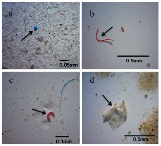 Types of MPs in the surface water and sediments from coastal Guangdong (a–d): (a) pellets, (b) fibers, (c) fragments, (d) films [].