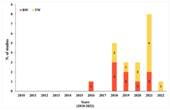 The interest in MPs detection in DW grew over years, as demonstrated by the increasing number of studies in this field of research (Figure 2). Over a time span of 13 years, the researchers returned 21 studies for drinking water, 12 for TW and 9 for BW. However, for both tap and bottled water, a relevant number of studies is only available from 2018, remaining the less studied field.