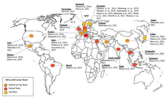 Figure 3 represented a geographical representation of data on MPs. MP occurrence was reported in TW in Germany [,,,], USA [], Mexico City [], France [], China [,,], Japan [], Saudi Arabia [], Norway [], Denmark [,] and Finland []. While MP occurrence in BW was reported in waters purchased from Germany [,,,], Thailand [], USA [], Italy [,,] and Saudi Arabia []. A larger study [] was carried out on BW purchased in many countries (Indonesia, USA, India, Mexico, England, France, Germany, Italy, Brazil, Lebanon and China).
