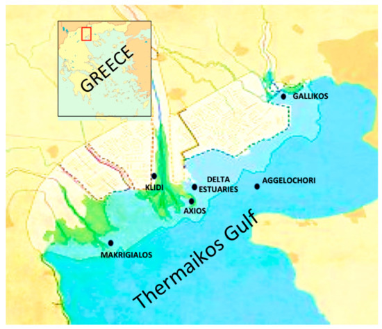 The sampling sites included five marine areas, which were within the Mytilus galloprovincialis farming area, whereas two sites originated from brackish waters near the estuaries of the deltas of the Axios and Gallikos rivers located in the Thermaikos gulf; in total six sampling sites (Figure 1). The Thermaikos gulf is a semi-closed estuary with a 90 m maximum depth and a surface of 5100 km2 that is in the northwest Aegean Sea in Central Macedonia, Greece. The sampling sites included Kavoura Chalastra (40°32′20.12′′ N, 22°44′56.63′′ E), Klidi Imathia (40°28′37.03′′ N, 22°39′58.94′′ E), Makrigialos Pieria (40°24′57.98′′ N, 22°37′14.93′′ E), Aggelochori Thessaloniki (40°29′30.05″ N 22°49′11.79″ E), the delta of the Axios river (40°37′50.85″ N, 22°50′46.13″ E), and estuary of the Gallikos river (40°37′50.85′′ N, 22°50′46.13′′ E) (Figure 1). These sites are all considered burdened owing to agricultural, industrial, veterinary, and urban wastes. However, they remain of high economic and environmental importance.