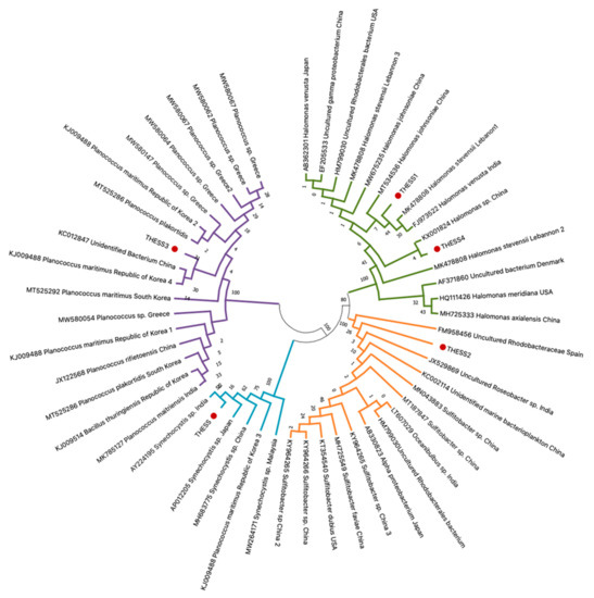 To the best of our knowledge, the present study constitutes the first report of the halophilic bacteria Halomonas sp., Sulfitobacter sp., and Planococcus sp. in water samples from the Thermaikos gulf, the major Mytilus galloprovincialis aquaculture area in Greece. In addition, in line with a recent study by our lab detecting microcystins in the same marine area [28], bacteria belonging to the Synechocystis genus were identified in seawater from the Thermaikos gulf. An investigation conducted from [22] that studied the variability of the sediment bacterial community composition and diversity from sediments in different regions of the Eastern Mediterranean Sea, including the Thermaikos gulf, revealed high richness in the sediment bacterial communities and noteworthy variability in bacterial composition in the different areas. The results revealed that Alpha- and Gammaproteobacteria were observed at high frequencies in most sediments. Another study revealed that in sediments derived from Thermaikos Gulf, the bacterial community included 31.7% Beta- and Gammaproteobacteria, 3.2% Alphaproteobacteria, and 1.6% Firmicutes [25]. In these bacterial groups, some halophilic and moderate halophils were included. It is reported that they can thrive with moderate salt concentrations (3–15% NaCl); however, if the salinity increases to extreme levels, they can occasionally grow as well [32].
