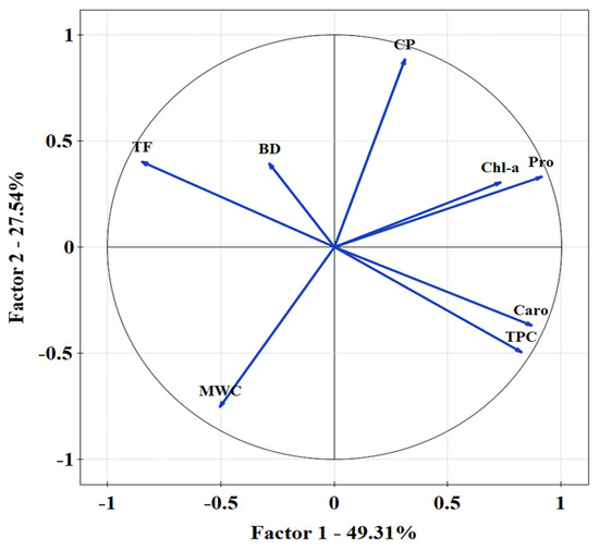 The lack of water leads to severe plant stress in drought-affected regions [47]. Water stress is measured by certain indicators, such as relative water content, photosynthetic pigments, and proline levels. Both relative water content and chlorophyll level have been correlated with drought tolerance [48]. With a reduction in transpiration rate, plants lose water as they become dehydrated. In response to drought stress, plants increase the expression of stress-related genes in aerial parts, including the genes involved in proline metabolism [49]. Salinity and drought lead to plants responding primarily through Pro accumulation, which regulates strategies to combat stress in agricultural production [21]. Chlorophyll can reflect the nutrition status of vegetation by providing an indication of vegetation stress and external disturbance [50]. Under drought stress, the chlorophyll content/components of the plants are usually altered, leading to a compromised photosynthetic apparatus [51]. Drought triggers a reduction in chlorophyll content, and Pro content increases many times under water stress [47]. The total porosity was correlated with both chlorophyll and Pro content, and bulk density was related to total phenolic content in this study.