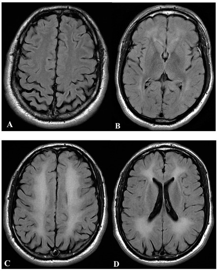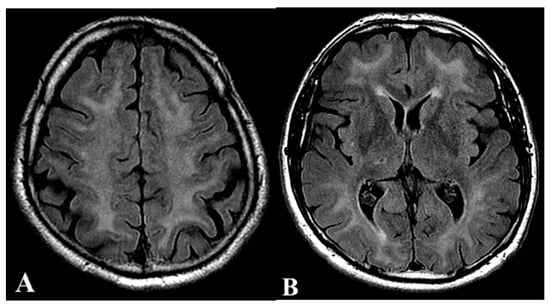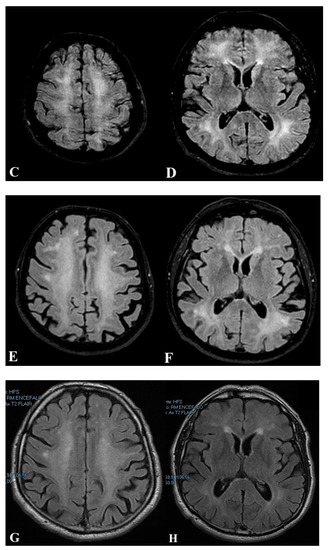 Two weeks later, the patient re-accessed the ED due to progressive neurological impairment in the last three days, described by his wife as confusion, space and time disorientation, memory alterations, muscle stiffness, and progressive loss of coordination. A brain CT scan did not show any abnormality, and the patient was discharged after scheduling a brain MRI. Five days later, the patient returned because cognitive symptoms further worsened, and both bladder and bowel incontinence appeared. After being admitted to the Neurology ward, EEG showed slowed bilateral frontal signals with peaky aspects not modified by stimulations. The neurological examination revealed extreme stiffness of the whole body, small steps walking, bradylalia, hypo-amimia, and retropulsion. A first MRI showed diffused leukoencephalopathy (Figure 2A,B).