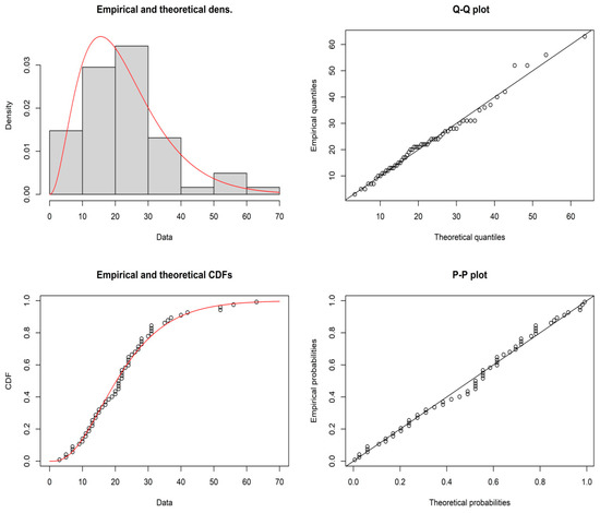 It is established that the daily number of cases data can be drawn from the GD with shape parameter = 3.1946 and scale parameter , and the maximum distance between the real-time data and the fitted of GD can be found from the Kolmogorov–Smirnov test statistic 0.0803 and also the p-value 0.8262. The demonstration of the goodness of fit for the given model, the empirical and theoretical pdfs, cdf, P-P plot and Q-Q plots for the GD for the daily number of cases data are shown in Figure 3. Therefore, GD is well fitted for the daily number of cases of COVID-19 data. The plan parameters for this shape parameter are shown in Table 9 and Table 10. For the proposed plan, the shape parameter is when = 0.04. Suppose that medical administrators are concerned with testing with the aid of the proposed sampling plan when = 0.04,, = 1.4, = 0.5, and = 0.10. From Table 9, it can be noted that = 55, , = 14, m = 1, and ASN = 55. The developed MDS sampling plan works by accepting the null hypothesis if the average daily number of cases in 6 days is more than equal to daily number of cases. A sample of 55 daily due to COVID-19 can be selected at random for a crowd of people, and the null hypothesis . If the average daily number of cases before is less than or equal to 6 days, then the crowd of people can be accepted, and the crowd of people can be rejected if it is greater than 14 days. If the prevalence of the number of cases of COVID-19 is between 6 and 14 days, a property of the present crowd of people can be deferred until the preceding crowd of people has be tested. From the data, it can be noted that an average daily number of cases of COVID-19 was greater than equal to encounter in more than 36 days; therefore, the claim about the average daily number of cases could be rejected. Hence, medical administrators could suggest to the government that the average daily number of cases of COVID-19 was at an unendurable stage. Therefore, the proposed sampling plan is useful in medical applications, specifically, in taking decisions regarding the daily number of cases of COVID-19 and the average daily number of COVID-19 patients, and this is very important for any government making policy decisions.