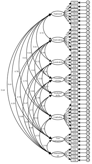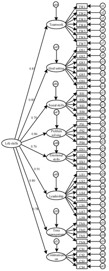 To assess the factorial validity of the C-LSSPE, CFA employing robust maximum likelihood estimation was conducted using AMOS software (Version 23.0, IBM Corporation, NY, the United States of America) [40]. This involved testing an eight-factor model representing all eight life skills, as well as a second-order model that included all eight life skills and a total life skills factor. The goodness of fit of the scale was evaluated by four fit indexes: chi-square divided by degrees of freedom (χ2/df), root mean square error of approximation (RMSEA) [41], comparative fit index (CFI) [42], and the Tucker–Lewis index (TLI) [43]. A χ2/df of less than 3.0 was indicative of adequate fit [44]. A RMSEA value of less than 0.08 or 0.05 represented a reasonable or close fit to the data, respectively. CFI and TLI values greater than 0.90 or 0.95 indicated acceptable and excellent fit, respectively [45]. Factor loadings were judged according to Comrey and Lee’s [46] criteria of loadings greater than 0.71 considered excellent, 0.63 as very good, 0.55 as good, 0.45 as fair, and 0.32 as poor.