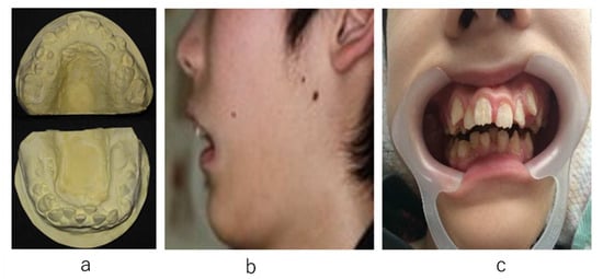Figure 1. Initiation of orthodontic treatment. (a): Study model. (b): Facial profile. (c): Frontal view of the dental arch at the first visit.