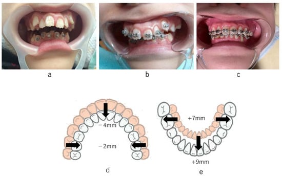 Figure 2. Prognosis of orthodontic treatment. (a): Fixed multi-bracket appliance placed on the mandibular anterior teeth (2 months after starting orthodontic treatment). (b): Fixed multi-bracket appliance placed on the maxillary anterior teeth (7 months after starting orthodontic treatment). (c): View of the anterior teeth at 6 years after the initiation of orthodontic treatment. (d): The length and width of the upper arch decreased by 4 mm and 2 mm, respectively. (e): The length and width of the lower arch increased by 9 mm and 7 mm, respectively.