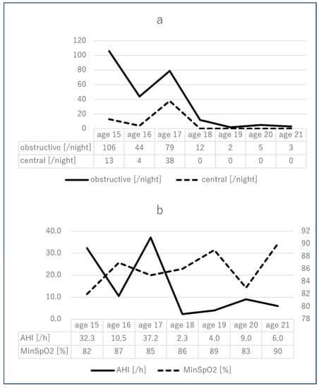 Figure 3. Time course of changes in the polysomnography examination. (a): The total number of obstructive and central sleep apnea events during sleeping at night. (b): Apnea–hypopnea index (AHI) score and minimum oxygen saturation (SpO2) during sleeping at night.
