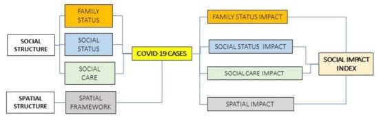 The proposed model considers the four categories of family status, social status, social care, and territorial or spatial framework for factorial analysis. Each category is considered to be fundamental to the social segregation of the urban space. They can be studied separately, but better conclusions can be obtained from their joint analysis. For this reason, the interactions across the four categories will be considered in the model, because, in turn, the categories are elements of the urban spatial structure. The definition of these categories and the establishment of their interrelationships makes the model useful and will serve as the basis for analyzing the factors responsible for determining the distribution of COVID-19 infections in any urban space. Here, examining the material and social capacities of the different social areas can reveal how spatial inequalities affect the spread and management of the pandemic.