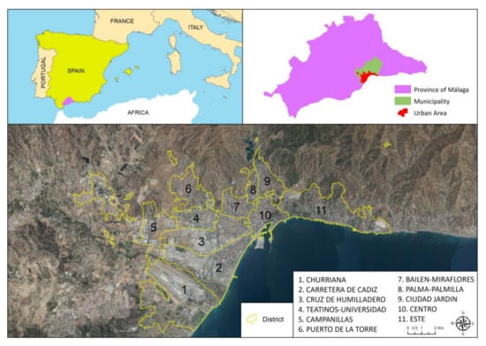 We start from the hypothesis of an unequal effect of the pandemic for the different areas, by visualizing the unequal incidence of COVID-19 disease in different urban spaces of the city of Malaga, Spain. In this geographic space, we apply a multidimensional analytic methodology based on defining four categories: three for social characterization, demographic, socioeconomic, and social care; and one for spatial characterization, territorial. Various recent reports have analyzed the influence of socioeconomic conditions on the living conditions and health of populations [,,] and the role of socioeconomic factors in the spread of the pandemic and its social consequences [,,,,,]. The local and intercity transmissions of COVID-19 have also been analyzed in studies examining the role of socioeconomic factors and public health measures imposed by health authorities [,].