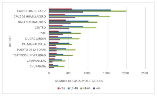 Analysis of the distribution of total infections by COVID-19 in the social areas of the city of Malaga during the period from 5 March 2020 to 31 March 2021. The behavior of the pandemic is observed through the cases of contagion in the districts of the city. Source: Author’s elaboration based on data from the Technical Subdirectorate of Information Management of the Andalusian Health Service (SAS), Regional Government.