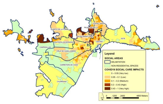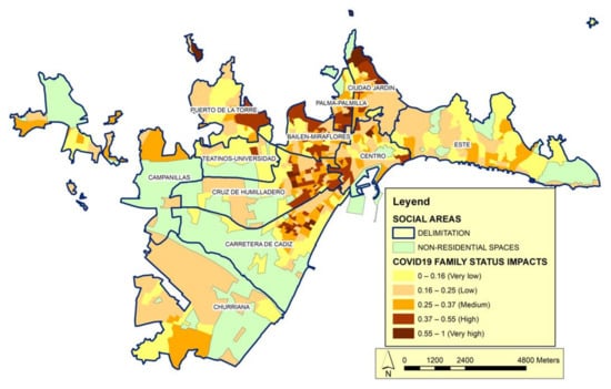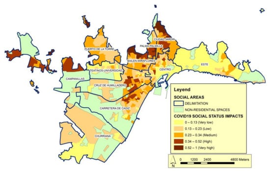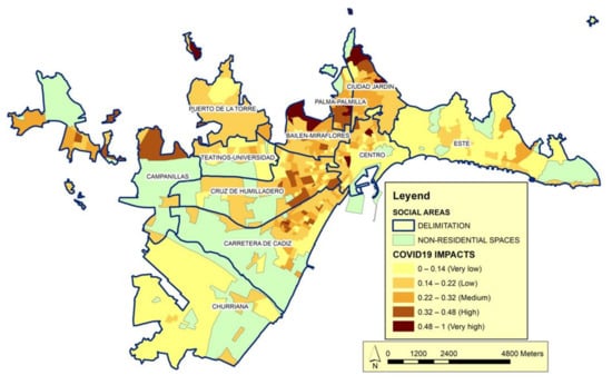 According to the selected categories (family status, social status, social care, and territorial framework), we calculate a social impacts index. We seek to highlight the substantial relationships between the social and family structures of the space and the evolution of the COVID-19 pandemic. Above, we describe the processes that allowed us to conceptualize the social and spatial structures based on the categories analyzed and consider the contagion expansion processes based on socio-spatial differentiation. Now, we bring them together to look at the evolution of the pandemic in the urban spaces of Malaga, with its differentiated social spaces. All of this is specified in the analysis of social vulnerability according to the categories of our model. From this perspective, differentiation is not strictly economic (although we undoubtedly reveal a very close relationship), but also relates to the social valuation of space as an indicator of the different outcomes for social groups under the pandemic.