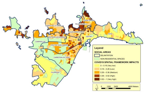 As can be seen in the Figure 9, many of the social areas located in historic urban developments (Ciudad Jardín, Palma-Palmilla; Bailén-Miraflores y Cruz de Humilladero) are among the most highly affected by the pandemic. These areas, without being on the extreme vulnerability, are on the highest vulnerability segments.