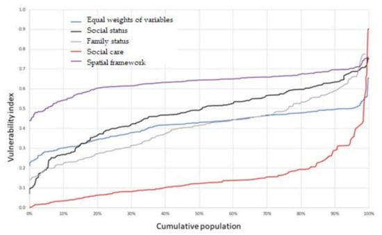 Figure 10 reveals that social care impact is not evenly distributed. High percentages of the population have a similar level, while a small percentage has a very high impact, causing the curve to become vertical in its last section. At the other extreme, we see that the influence of territorial impact is more evenly distributed and homogeneous across the population. Social impact, which presents a steep final slope, responds to the disparity of social status in the analyzed urban space.
