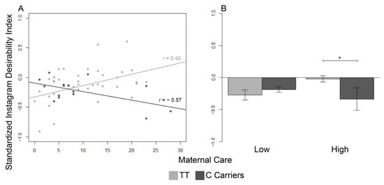 (A): Effect of the interaction between genotype and maternal care on the standardized Instagram Social Desirability Index. Correlations between the Social Desirability Index and the reported maternal care. Black circles = C-carriers; gray circles = T/T homozygotes. Lines represent the linear models for C-carriers (black) and T/T homozygotes (grey). Pearson’s r values are reported. (B): Comparison between Social Desirability Index in C-carriers (black) and T/T homozygotes (gray) divided into high and low maternal care. (* p < 0.025).