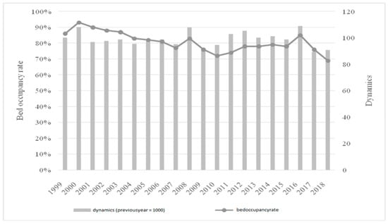Changes in the analyzed facility did not correspond to the results for the entire Podkarpackie voivodeship. There was a significant increase in the number of hospital beds per 10,000 people. It spiked from 42.27 to 46.66, which was 4.39 beds per 10,000 population. This upward trend also applied to other regions of the country, as there was a decrease in the number of beds per 10,000 inhabitants in only 6 out of 17 voivodeships. In addition to the number of beds, attention should be paid to their occupancy within the institution, which allows for better identification of the actual need for them. The data are presented in Figure 3.