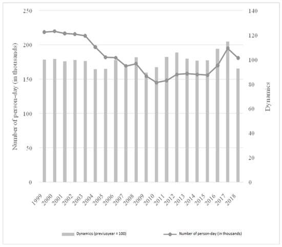 The results show that the number of person-days in the analyzed facility decreased in 1999–2018. Between 1999 and 2016, there was a decrease from 218.4 to 170.0 (the minimum level was 145.1 person-days in 2010). By shortening the length of stay of patients, it was possible to maximize the use of hospital beds. Table 4 shows the average length of stay of patients by hospital wards.