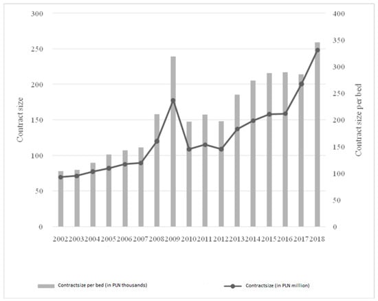 The relationship between hospital beds and a contract for the hospital in Rzeszow was also investigated. It was found that significantly more funds were allocated per bed, which is a positive change resulting from the general increase in health care financing in Poland. The already-mentioned Porębski indicated that the size of the contract depended on the stability of the hospital, and the extent to which the resources, including beds, could be used effectively by the facility []. Many hospitals are struggling with contract amounts that are too low, which reduces budgetary stability. Sometimes this is the fault of unfavorable structures of procedure financing by the National Health Fund, but it may also be due to the fact that the institutions’ processes are not appropriate, and some restructuring is necessary [,]. Regardless of these considerations, higher funding per bed translates into better operational possibilities, although it is necessary to recall the importance of the inflation factor and the general increase in the prices of medical procedures, which results from, e.g., progress in the field of pharmacology and medical technology.