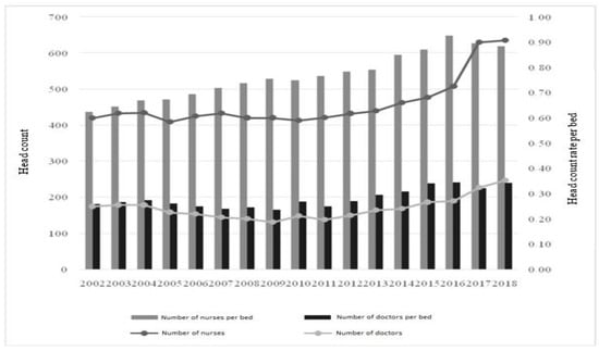In the analyzed period, an increase in employment of both nursing and medical positions was observed. Between 2002 and 2016, the number of nurses increased from 419 to 507; for doctors, there was an increase from 174 to 189. Further increases resulted from the merger with the lung disease clinic. Taking into account the fact that head count increased, and the number of beds was reduced, the ratio of nurses per bed had to increase. There was a change from 0.62 to 0.93 in 2016 and 0.88 in 2018 after the merger with the pulmonary clinics, while for doctors it was 0.26 in 2002 and 0.34 in both 2016 and 2018. The main findings of the research section are referred to in the discussion.
