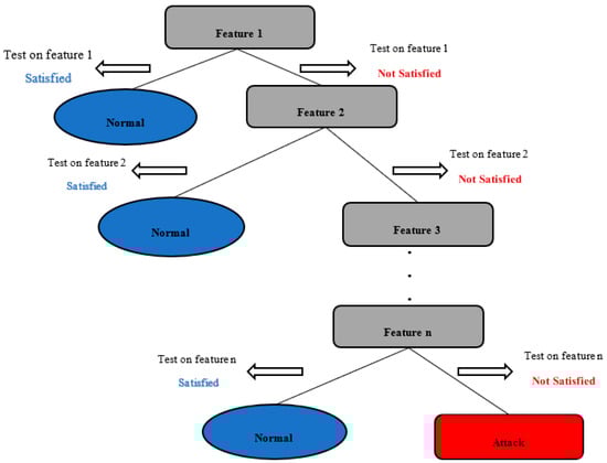 The DT can be defined as a predictor d: []. The goal of the predictor d is to forecast the label y of a sample u by learning decision rules inferred from the training set while using a tree representation to this end. The tree representation starts by a root node and goes all the way to each leaf node. It is noteworthy that in the case of a classification problem, the best (i.e., most important) feature is always placed at the root node of the tree representation while each leaf node contains a specific label. A feature selection technique such as the information gain, the Gini index, the principal component analysis, or the genetic algorithm is usually used as the criterion to decide the importance of a feature in a given dataset [,,]. Figure 2 shows the generic diagram of a DT algorithm in the case of a binary classification of traffic flows in SDWSN-based IoTs.