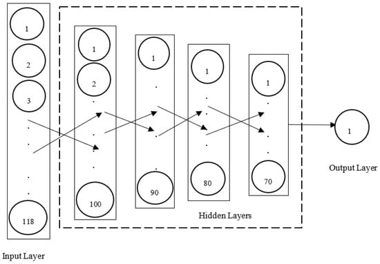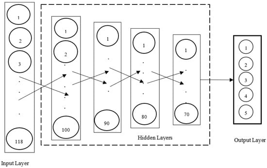 We used a library called keras [] to build a deep ANN composed of an input layer with 118 features, four hidden layers with 100, 90, 80 and 70 neurons, respectively, and an output layer with one neuron. The activation functions used for the neurons in the hidden layers were all the ReLU while the activation function used for the neuron in the output layer was the sigmoid function. Given that the output neuron had a sigmoid activation function, it should be noted that the output layer yielded decimal numbers between 0 and 1 which are the probabilities of the output to be a normal traffic. In order to classify an input as normal (i.e., first class), its probability had to be superior to 0.5 and conversely an abnormal input (i.e., second class) had a probability equal or inferior to 0.5 [,,,]. A grid search approach was used to select the optimal initial learning rate (i.e., 0.00001) by choosing the one leading to the highest performance metrics. Figure 5 shows the deep ANN that was built for the binary classification of traffic flows in SDWSNs. Table 4 indicates the performance metrics achieved by the deep ANN-based anomaly detector for three initial learning rates.