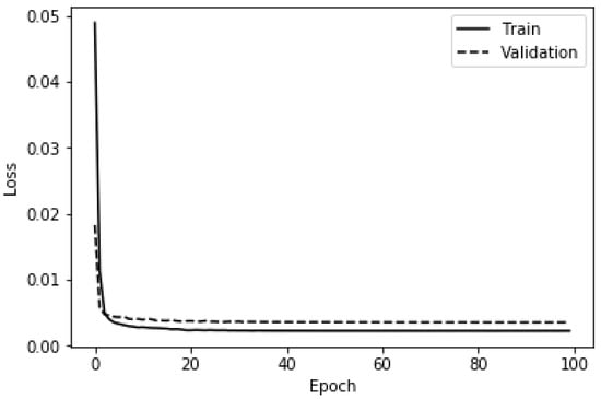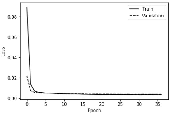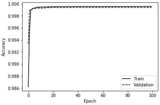 It should be pointed out that in accordance with the best practices in machine learning, a validation set was built by putting aside a quarter of the training set in order to select the optimal hyperparameters (e.g., learning rate reduction factor, initial learning rate) and avoid overfitting [,]. In the same vein, the validation loss was monitored, and the learning rate was reduced by a factor of 0.35 if the validation loss did not improve after five successive epochs. Moreover, the maximum number of epochs was fixed to 150 while the minimum learning rate was fixed to 0.0000001. An early stopping was set to occur when the validation loss plateaued after 10 successive epochs. The binary cross-entropy was used as the loss function to keep track of how well the deep ANN was performing. Figure 6 and Figure 7 depict, respectively, the accuracy and the loss yielded by the deep ANN on the train set and the validation set using the aforementioned hyperparameters. It can be concluded from Figure 6 that the overfitting did not occur because the training accuracy and the validation accuracy are almost equal throughout the training phase of the deep ANN. Table 5 gives the metrics recorded while training and evaluating the deep ANN-based anomaly detector.