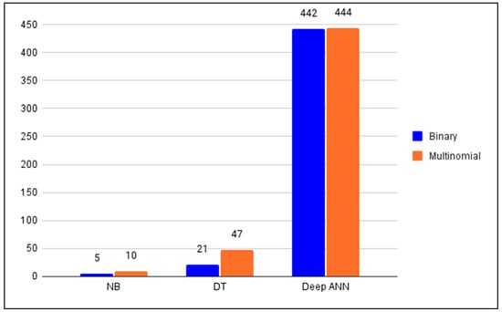 This paper is an extended version of our works [,] published in the proceedings of the IEEE 28th International Symposium on Industrial Electronics (ISIE). As it was the case in our previous works, the accuracy, the F-score, the prediction time, the run time, and the memory size are used in this paper to make a fair comparison between these three anomaly detectors (i.e., DT, NB, and Deep ANN) and give orientations on the choice of the adequate approach to be used as the IDS for SDWSNs of different sizes. Our previous works were extended by introducing in this paper the multiclass classification besides the binary classification and given that the accuracy and the F-score are the performance metrics used to evaluate the state-of-the-art IDS in the body of literature [], a particular focus was placed in this work on building algorithms that would yield state of the art accuracies (binary classification) and F-scores (multinomial classification). Furthermore, the underlying algorithms behind each of the three anomaly detectors were briefly described. Most importantly, example of applications in the healthcare sector were proposed and conclusions were drawn after evaluating, discussing, and benchmarking against the state-of-the-art approaches the performances of the three anomaly detectors developed in this paper.