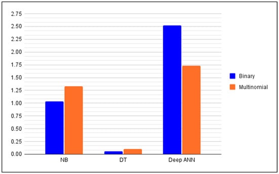 The default parameters of the Gaussian NB classifier provided in the sklearn library [,] were used to train the NB-based anomaly detector. Table 3 gives the metrics recorded while training and evaluating the NB-based anomaly detector.