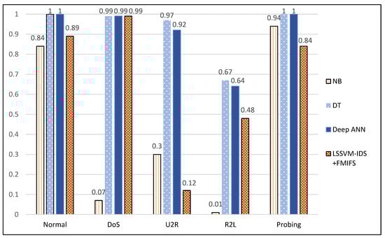 The NSL-KDD dataset is an upgraded and reduced version of the KDD cup 1999 dataset []. The NSL-KDD dataset was introduced to mitigate a number of issues (e.g., elimination of redundant records) found in the KDD cup 1999 dataset with the aim of speeding up and simplifying the development of anomaly detectors while bettering their performances. The accuracy, the precision, the recall, and the F-score [,] are four metrics widely used in the literature to gauge the performance of classifiers. By definition, the accuracy represents the ratio between the correctly classified records and all classified records. In the case of an anomaly detector performing a binary classification between attacks and normal traffics, the True Positive (TP) represents the proportion of attacks correctly classified; the True Negative (TN) represents the proportion of normal traffics correctly classified; the False Positive (FP) represents the proportion of normal traffics incorrectly classified and the False Negative (FN) represents the proportion of attacks incorrectly classified. For this reason, the accuracy can be mathematically formulated as a function of TP, TN, FP, and FN. From a mathematical point of view, the precision and the recall can also be formulated in one way or another as functions of TP, TN, FP and FN []. The F-score is a metric that combines the recall and the precision to gauge the performance of a classifier.