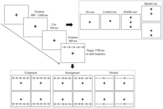 Each trial started with the presentation of a fixation cross from 400 to 1600 ms in random order. Then, one of four possible cues appeared for 100 ms: no cue, a center cue, a double cue, or a spatial cue. For the no cue condition, only a fixation cross was presented. In the center cue condition, the fixation cross was replaced by an asterisk. In the double cue condition, two asterisks were presented, one above and one below the fixation cross. In the spatial cue condition, one asterisk was presented, either above or below the fixation cross. When the cue disappeared, the fixation cross continued to be presented for 400 ms. Thereafter, a response stimulus was presented above or below the fixation cross. The response stimulus consisted of a central target and four flankers, two flankers on either side of the central target. The relationship between the central target and the four flankers was divided into three conditions: congruent, incongruent, and neutral. In the congruent condition, both the central target and the four flankers were arrows that all pointed leftward or rightward, with the direction of the central target the same as that for the four flankers (i.e., →→→→→). In the incongruent condition, both the central target and the four flankers were also arrows that pointed either leftward or rightward, but the direction of the central target was different from that of the four flankers, which were all in the same direction (i.e., →→←→→). In the neutral condition, the central target was an arrow that pointed leftward or rightward, but the four flankers were lines without arrowheads (i.e., −−→−−). Participants were instructed to decide the direction of the central target as quickly and accurately as possible by pressing the corresponding key on a numeric keyboard. A central target with a left direction was assigned to the “1” key to be pressed with the left index finger, and a central target with a right direction was assigned to the “3” key to be pressed with the right index finger. Participants had to respond with a key press within 1700 ms, otherwise, the next trial was triggered.
