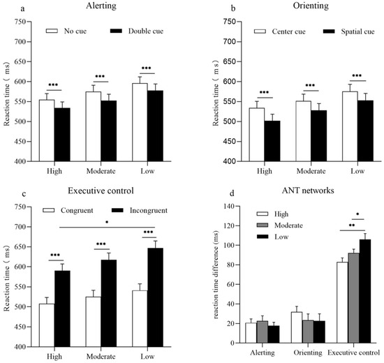 Reaction times for three levels of physical activity in each network. (a) For the alerting network, the bars represent mean reaction times as a function of an alerting effect and physical activity group. White bars represent reaction times for the no cue condition, and black bars represent reaction times for the double cue condition. (b) For the orienting network, the bars represent mean reaction times as a function of an orienting effect and physical activity group. White bars represent reaction times of the central cue condition, and black bars represent reaction times of the spatial cue condition. (c) For the executive control network, the bars represent mean reaction times as a function of a congruency effect and physical activity group. White bars represent reaction times for the congruent condition, and black bars represent reaction times for the incongruent condition. (d) Bars represent the reaction time differences between a specific cue or a flanking condition that reflect the efficiency of the Attention Network Test (ANT) networks for the high, moderate, and low PA groups. Error bars represent standard error of mean (SEM). * p < 0.05; ** p < 0.01; *** p < 0.001.