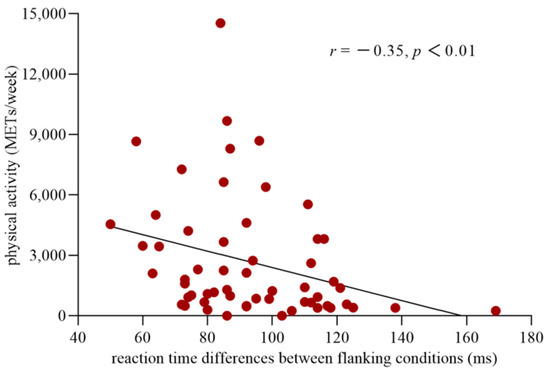 The distribution of the data for executive control was normal (Kolmogorov–Smirnov = 0.11, p = 0.09). However, the data for the level of PA were not normally distributed (Kolmogorov–Smirnov = 0.20, p = 0.00). Thus, a logarithmic conversion was performed on the data for the PA level to fulfill the prerequisite for the use of Pearson correlation analyses. The results of the correlation analysis showed a significant correlation between executive control and the level of PA (r(57) = −0.35, p < 0.01) (Figure 3), with a correlation coefficient higher than 0.3 considered a moderate correlation [41]. This finding indicated that the more PA an individual participated in, the less conflict effect they experienced and the higher the efficiency of their executive control network.
