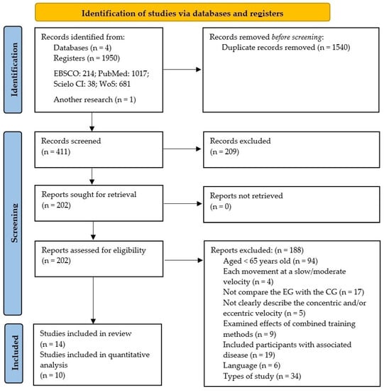 Trials were excluded if: (1) studies included participants with age < 65 years old; (2) participants performed an intervention other than HSRT; (3) did not compare the results of the EG with the CG; (4) did not clearly describe the concentric and/or eccentric velocity; (5) examined of the effects of combined training methods (i.e., fast-intended- and moderate-velocity or balance training); (6) included participants with any associated disease (i.e., cancer, dementia, diabetes) or non-physically independent; (7) written in a language other than English, Portuguese, or Spanish; and (8) other article types than original (e.g., reviews, letters to editors, trial registrations, proposals for protocols, editorials, book chapters, and conference abstracts).