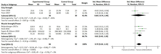 In the same sense, six articles indicated moderate effects on neuromuscular function (analyzed through grip strength and muscle and power outcomes) in favor of intervention groups compared to control groups (p = 0.003, SMD = 0.70 [0.24, 1.15], I2 = 53%); see Figure 3. Finally, the analysis of the effects on physical function was divided into approaches in order to facilitate the interpretation of the results (Figure 4A,B). Consequently, this figure shows moderate effects on physical function in favor of intervention groups compared to control groups (Figure 4A, p = 0.004, SMD = 0.55 [0.02, 1.07], I2 = 72%; and Figure 4B, p = 0.009, SMD = −0.59 [−1.27, 0.08], I2 = 35%).