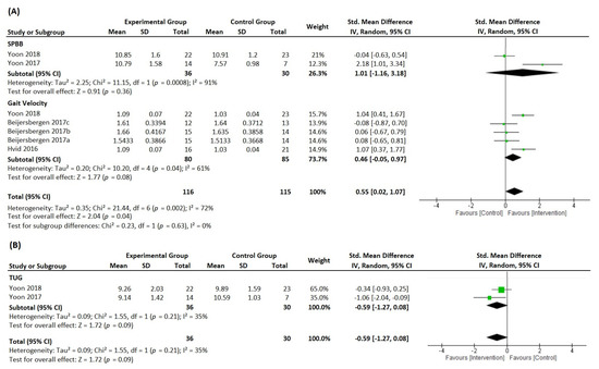 Forest plot presenting standardized mean difference and 95% confidence intervals from studies reporting high-speed resistance-training-induced changes in physical function ((A), through SPBB and gait velocity; (B), through TUG) between the intervention groups and the control groups. IV, independent variable; CI, confidence interval; SMD, standardized mean difference; SPPB, short physical performance battery; TUG, timed up and go test [54,55,56,61,66,67].