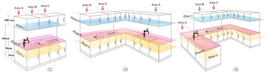 Different kitchen types’ zoning diagram. (1) I-shaped kitchen. (2) L-shaped kitchen. (3) U-shaped kitchen. Kitchen space façade partition is defined as (A) washing area, (B) preparation area, and (C) cooking area. Kitchen space plane partition height is defined as (a) yellow zone: bending posture storage space height of 50 cm; (b) red zone: normal standing posture, the ideal counter height of 90 cm; (c) blue zone: high cabinet storage space height of 180 cm or more.