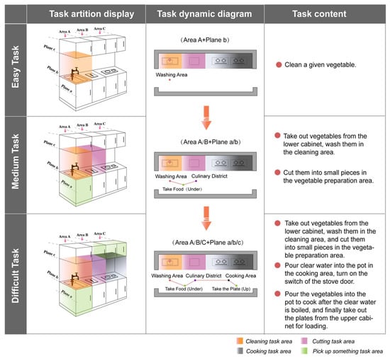 To better carry out the tasks, the kitchen space was divided into nine equivalent system areas according to the use functions through the plan and elevation zoning of the space. The tasks with equal difficulty in different kitchens were named according to the functional areas through which the participants completed the layered tasks, taking the I-shaped kitchen as an example (Figure 2).