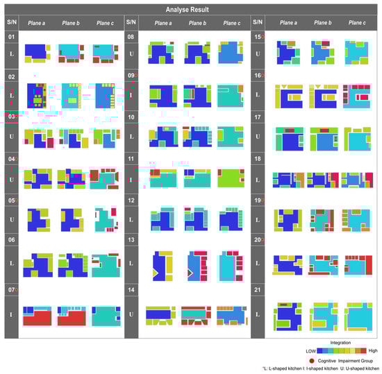 According to the planar partition of the kitchen space, the kitchen space of the twenty-one participants’ homes was dimensionally extracted []. The kitchen plane corresponding to planes a, b, and c was depicted using AutoCAD and then imported into DepthmapX for convex map analysis. The warmer the color in the analysis results, the higher the corresponding spatial parameter value; conversely, the cooler the color, the lower the parameter value []. Our analysis found that the spatial layout of all kitchen samples contained 11 L-shaped cases, 7 U-shaped cases, and 3 I-shaped cases (Figure 3).