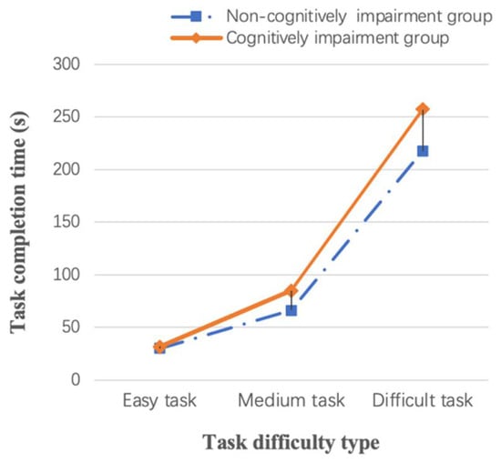 Table 3 shows the results of the one-way ANOVA for the three task completion times. We found significant differences in the variable of completion time between tasks (F = 897.761, p < 0.05), which indicates that the task difficulty was successfully set in the pre-study period and can be used for subsequent predictive analyses. It is clear that, in the difficult task, older adults in the cognitively impaired group took longer to engage in the kitchen activity compared to the easy and medium tasks, which may be related to their weakened perceptual and comprehension abilities (Figure 4).