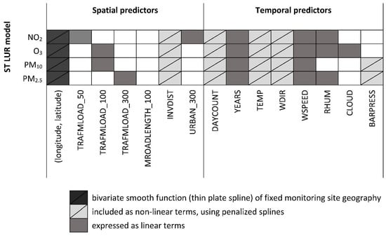 We developed semi-parametric ST LUR models to predict daily NO2, O3, PM10 and PM2.5 concentrations at any point of interest in the study area, for the years 2009 to 2013. Similar to the approach previously applied previously in Athens, Greece [26,27], the log-transformed air pollutant measurements (except for O3 as it was normally distributed) at location 𝑖 on day 𝑡 was modeled using a set of covariates that had either a linear or a smooth effect on the pollutant; plus a bivariate smooth function of the fixed monitoring sites’ geographical location (longitude, latitude) in order to account for remaining spatial correlation. We used available air pollution measurement data, while 97 potential predictors of air pollutants’ spatio-temporal variability were tested. These variables can be classified in four categories: (a) land use type (Land Cover Map—LCM of Great Britain from 2007) in a buffer range of 100 to 5000 m (m) around each fixed monitoring site (precisely, 100, 300, 500, 1000, and 5000 m); (b) meteorological variables, obtained from the UK Meteorological Office (daily mean): temperature (°C), relative humidity (%), wind direction (°N), wind speed (m/s), cloud coverage (okta), barometric pressure (mBar/hPa) and solar radiation (W/m2); (c) traffic-related: total length of major roads (m) in buffers of 25, 50, 100, 300, 500 and 1000 m, inverse distance of the fixed monitoring sites to the nearest major road (m−1), and traffic intensity on the nearest major road (veh day−1) to the fixed monitoring site and total traffic load within each buffer of 25 to 1000 m (veh day−1 *m). Traffic counts were obtained from the Department of Transport in the United Kingdom; (d) indicators: of linear trend within a year (a day count variable accounting for trends within each year coded from 1 to 365 or 366), of linear trend over the years of the study period (4 dummy variables with year 2009 as reference category) and the day of the week (6 dummy variables with Sunday as the reference category). For the smooth function we used a penalized spline with degrees of freedom (df) estimated via Restricted Maximum Likelihood (REML). Regarding all continuous variables, the final model included the term (linear or smoothed) that provided the better model fit. The final set of explanatory variables was selected based on the model’s adjusted-R2 value. Apart from the adjusted-R2 value, the coefficient of spatial covariates had to conform to the pre-defined direction of effect. The addition of variables was continued until none added more than 1% to the value of adjusted-R2. The final variables included in each of the ST LUR models are shown in Figure 2. All the predictor variables of the spatial variation of O3, PM10 and PM2.5 concentrations are traffic related. For NO2, the spatial variables included in addition to traffic-related variables, also a land use type (area characterized as urban within a buffer of 300 m) variable.