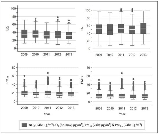 Figure 3 shows the yearly pattern (2009 to 2013) of the combined estimates derived from independent exposure assessment methods, within a GAM. The distribution of the estimated pollutant concentrations over the study period is similar. PM concentrations have more outliers compared to NO2 and O3 series.