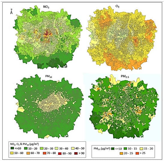 Publicly archived datasets analyzed in this study: Census 2011 data; https://data.london.gov.uk/dataset/2011-census-demography (accessed on 1 March 2017); London Air Quality Network (LAQN). King’s College, London. Available online: http://www.londonair.org.uk/ (accessed on 1 March 2017); London Datastore (accessed on 13 April 2020). Available online: https://data.london.gov.uk/dataset/lsoa-atlas (accessed on 18 November 2016); Air Quality England (AQE). Ricardo Energy and Environment. Available online: http://www.airqualityengland.co.uk/ Automatic Urban and Rural Network (AURN) (accessed on 1 March 2017). Data Archive: Available online: https://uk-air.defra.gov.uk (accessed on 6 December 2016); Land Cover Map. Available online: http://www.ukso.org/static-maps/land-cover-map.html (accessed on 29 November 2016); UK Meteorological Office, Available online: https://www.metoffice.gov.uk/research/climate/maps-and-data/historic-station-data (accessed on 21 November 2016); Department of Transport in the United Kingdom, Available online: https://data.gov.uk/dataset/d1f9e79f-d9db-44d0-b7b1-41c216fe5df6/national-public-transport-data-repository-nptdr (accessed on 4 August 2017); EMEP European emissions (accessed on 15 June 2016), Available online: https://www.ceip.at/; CERC, ADMS Roads v4 User Guide. (accessed on 15 December 2016) Available online: http://www.cerc.co.uk/environmental-software/assets/data/doc_userguides/CERC_ADMS-Roads4.0_User_Guide.pdf (accessed on 15 December 2016); Greater London Authority (GLA). The London Atmospheric Emissions Inventory 2013. Available online: https://data.london.gov.uk/dataset/london-atmospheric-emissions-inventory-2013 (accessed on 6 December 2016).