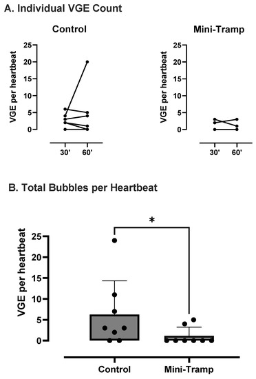 VGE peak count per heartbeat was analyzed for each condition (Figure 1.). No significant difference was found between the 30 and 60 min measurements (control: 2.4 ± 1.9 vs. 3.9 6.8 VGE per heartbeat, p = 0.78; mini trampoline: 0.6 ± 1.1 vs. 0.5 ± 1.0 VGE per heartbeat, p > 0.99). Therefore, results of both measurements were added to compare conditions. Compared to the control, VGE count was significantly reduced after trampoline preconditioning (control: 3.1 ± 4.9 VGE per heartbeat vs. MT: 0.6 ± 1.1 VGE per heartbeat, p = 0.031) (Figure 1).